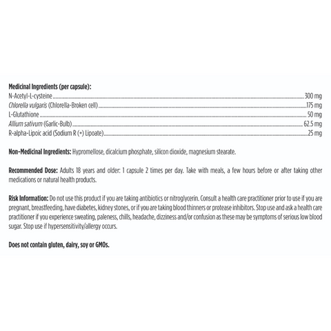 MX Synergy is formulated to support the body’s natural antioxidant defenses. Each two-capsule serving delivers 600 mg of N-acetyl-cysteine and clinically relevant amounts of reduced glutathione, organic chlorella, garlic powder, and R-lipoic acid.